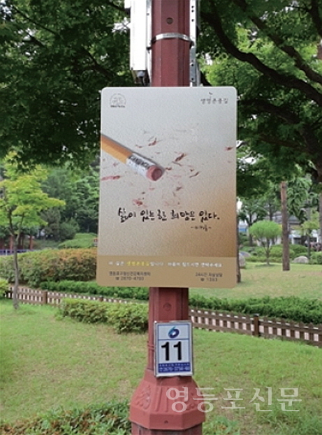 [영등포신문=변윤수 기자] 영등포구보건소가 지역 내 통행량이 많은 장소에 삶의 희망을 주는 글귀가 적힌 패널을 설치해 자살률을 낮추고자 ‘생명 존중 길’을 운영한다.