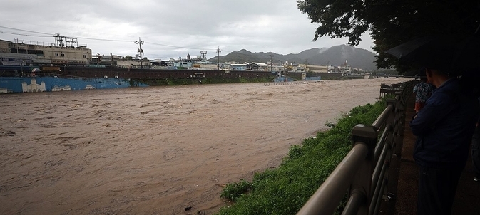 [영등포신문=변윤수 기자] 7일 밤사이 내린 많은 비로 홍수주의보가 내려진 전북 전주시 전주천 서천교에서 시민들이 불어난 물을 걱정스럽게 바라보고 있다.