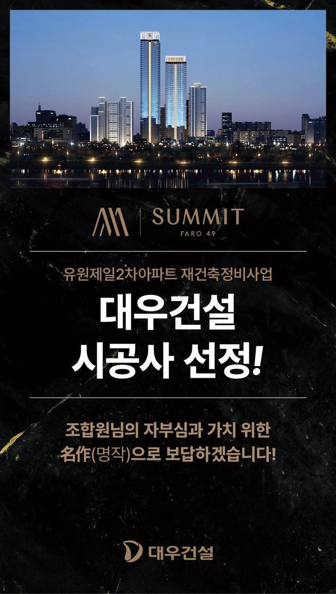 이날 총회에서는 조합원 443명 중 401명이 투표에 참여해 투표율이 90.5%에 이르렀으며 250명 찬성으로 대우건설이 시공사로 선정됐다.
