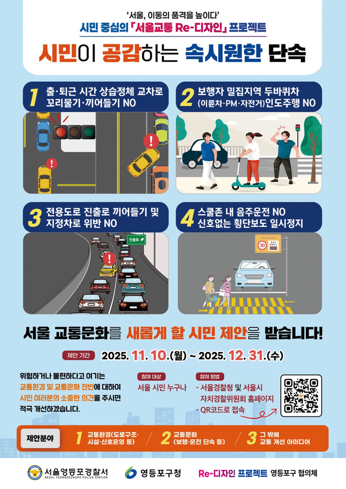 경찰은 오는 12월 31일까지 시민들로부터 위험하거나 불편하다고 생각하는 교통환경 및 교통문화 전반에 대한 개선 의견 또는 아이디어를 QR코드, 전화, 서면 등으로 받을 예정이다.