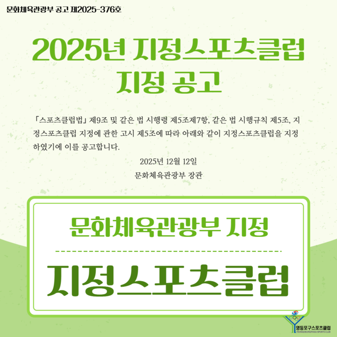 [영등포신문=변윤수 기자] 영등포구스포츠클럽이 스포츠클럽법에 따른 문화체육관광부에서 지정하는 ‘지정스포츠클럽’으로 최종 재지정됐으며, 지역 기반 스포츠클럽으로서의 위상을 다시 한 번 공식적으로 인정받았다.