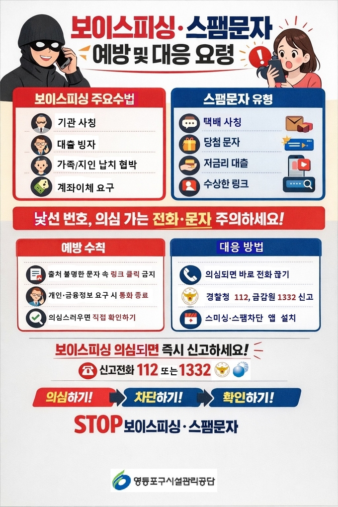 [영등포신문=이천용 기자] 영등포구시설관리공단(이사장 김형성)에서 관리하는 영등포동 공공복합센터는 지역주민을 대상으로 ‘보이스피싱·스팸문자 피해 예방 및 대응 방법’ 홍보 활동을 전개해 보이스피싱 근절과 피해 예방에 적극 나서고 있다.