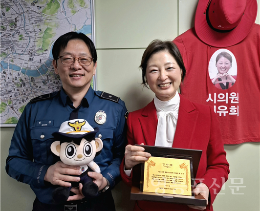 [영등포신문=이천용 기자] 서울시의회 최유희 의원(국민의힘, 용산2)은 서울경찰 직장협의회로부터 경찰 복지 향상과 사기진작에 기여한 공로를 인정받아 감사패를 수상했다. 이번 감사패는 서울에서 근무하는 경찰관들의 복지 개선을 위한 예산 확보 노력과 지속적인 관심에 대한 감사의 뜻을 담아 전달됐다.
