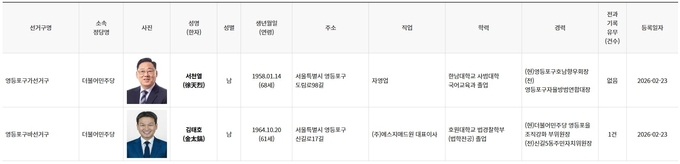 [영등포신문=이천용 기자] 오는 6월 3일 실시되는 제9회 전국동시지방선거에 출마하기 위해 영등포구선거관리위원회에 등록한 영등포구 지역 구청장, 구의원 예비후보 현황은 아래와 같다. (2026년 2월 24일 오후 2시 현재/ 출처: 중앙선거관리위원회 선거통계시스템)