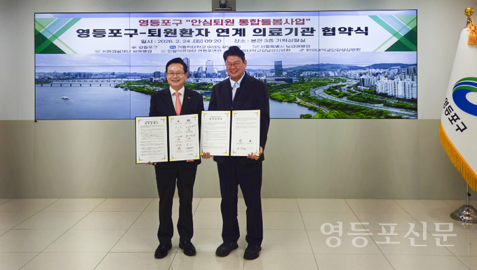 [영등포신문=변윤수 기자] 인봉의료재단 영등포병원(의료원장 유인상)은 2월 24일 영등포구청에서 열린 ‘영등포구 안심퇴원 통합돌봄사업’ 퇴원환자 연계 의료기관 협약식에 참석해 지역사회 통합돌봄 연계 체계 구축을 위한 업무협약을 체결했다고 밝혔다.