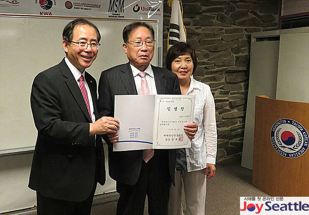 시애틀을 방문중인 새정치민주연합 김성곤 의원은 22일 타코마한인회관에서 열린 재외동포간담회를 끝낸 후 문재인 세계한인문주회의 의장의 임명장을 이정주 대표에게 전달했다.