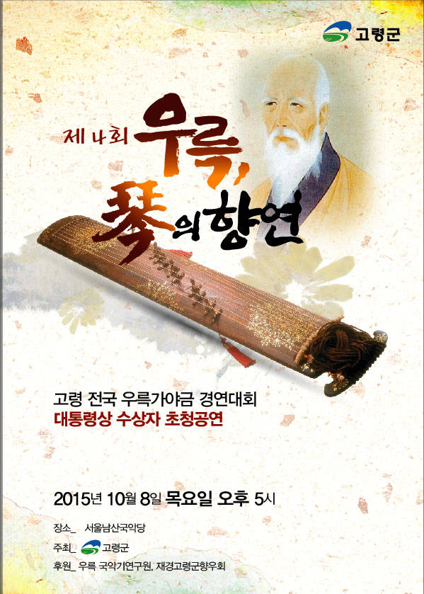 [영등포신문=김경진 기자=이경화 기자] 우리나라 최고의 국악기로 자리하고 있는 가야금의 창제자 악성 우륵의 본고장 고령군에서 열리는 ‘전국 우륵가야금경연대회’는 가야금의 발전·보급과 우리국악의 우수성을 널리 알리고 악성 우륵의 업적을 기림을 목적으로 24회째 치뤄지고 있고, 대통령상을 배출하는 뜻 깊은 대회로 고령군에서 전국 우륵가야금경연대회 대통령상 수상자들을 초청해 서울 남산국악당에서 아래와 같이 ‘제4회 연주회’를 개최한다.