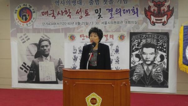 김경자의원은 축사를 마치고 “역사의병대 첫돌기념 매국사학 성토 및 결의 대회 개최를 진심으로 축하한다. 작년 8월 25일 창립이후 지난 1년 동안의 성과를 보니 무척 고무적이다. 이후에도 역사의병대가 국사광복의 첨병이 되고 나아가 민족사학의 수호자가 되어 주기를 바란다”고 말했다.