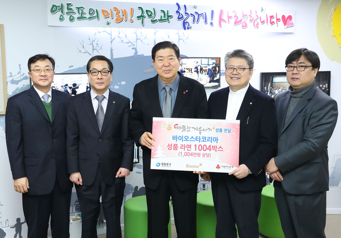 [영등포신문=장남선 주부기자] 조길형 영등포구청장(가운데)이 14일 오전 구청 3층 구청장실에서 바이오스타코리아로부터 1천만 원 상당의 성품을 후원받고 기념촬영을 하고 있다.