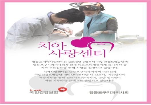 영등포북부지사 내에 위치한 ‘치아사랑센터’는 지난 2008년 7월에 개소했으며, 매주 월요일 저녁마다 의료소외계층에게 틀니제작 등의 무료 치과진료를 제공하고 있다.