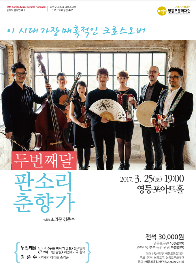 [영등포신문=신예은 기자] 영등포문화재단(이사장 조길형)은 영등포아트홀의 시즌 기획공연으로 에스닉밴드 <두번째달>과 국립창극단의 젊은 <소리꾼 김준수>가 함께 완성시킨 공연 [두번째달-판소리 춘향가]를 3월 25일(토) 저녁 7시 영등포아트홀 무대에 올린다.