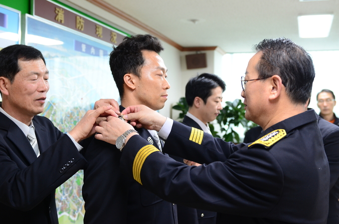 이번 승진자는 현장대응단에 근무하는 강규봉주임이 지방소방교에서 지방소방장으로 윤성민 반장 지방소방사에서 지방소방교로 동료들의 축하속에 한 계급 승진하게 되었다.