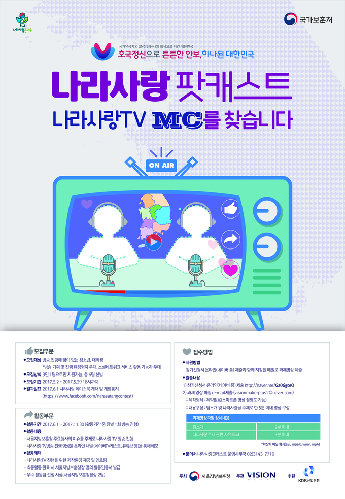 3인 구성의 팀으로 지원 가능하고 총 6팀을 선발하며 활동 기간은 2017년 6월 1일부터 11월 30일까지다. 나라사랑의 의미를 되새기고, 팟캐스트 방송을 진행하고 싶은 열정 있는 청소년, 대학생이라면 누구나 지원 가능하다.