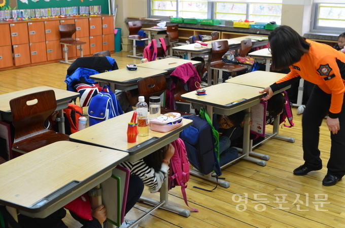 [영등포신문=신예은 기자] 영등포소방서는 17일 오전 영등포구 대림로 대동초등학교에서 수업 중 지진 발생 시 행동요령에 대한 실습을 했다.