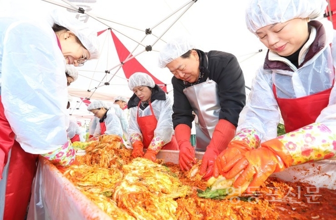 [영등포신문=신예은 기자] 조길형 구청장이 22일 ‘꿈이 닿은 농장’에서 열린 ‘사랑의 김장 담그기’ 행사에 참석해 직접 김치를 버무리고 있다.