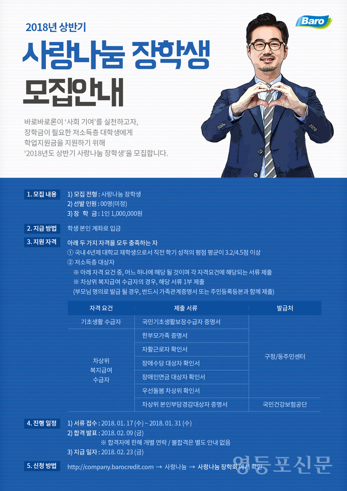 [영등포신문=신예은 기자] 바로크레디트대부가 17일부터 ‘2018년 상반기 사랑나눔 장학생’을 모집한다.