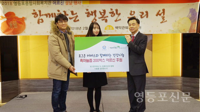 [영등포신문=신예은 기자] 건강식품 제조 및 유통 전문기업 로그온커머스(대표 조한희) 임직원들이 13일 신길동에 위치한 백악관웨딩문화원에서 열린 초록우산 어린이재단 영등포종합사회복지관(관장 심형래) 주관 '2018 어르신 설 명절행사'에 참석해 명절선물 후원과 점심 배식 봉사활동하는 시간을 가졌다.