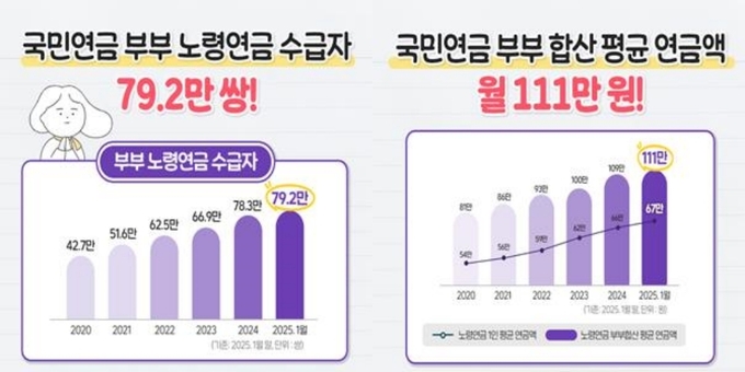 공단에 따르면 2025년 1월말 노령연금을 함께 받는 부부는 79.2만 쌍으로, 2020년말 대비 1.9배가 증가했고, 부부 합산 평균 연금액도 월 111만원으로 2020년 81만 원에서 꾸준히 증가세를 보이고 있다.