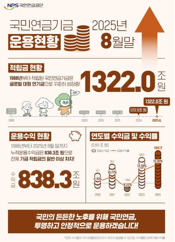 국민연금공단이 기금운용본부 홈페이지에서 공개한 자료에 따르면, 2025년 8월말 기준 국민연금기금의 적립금은 1,322조 원을 기록했다. 올해 8월까지 수익률은 8.22%(금액가중수익률)이다.