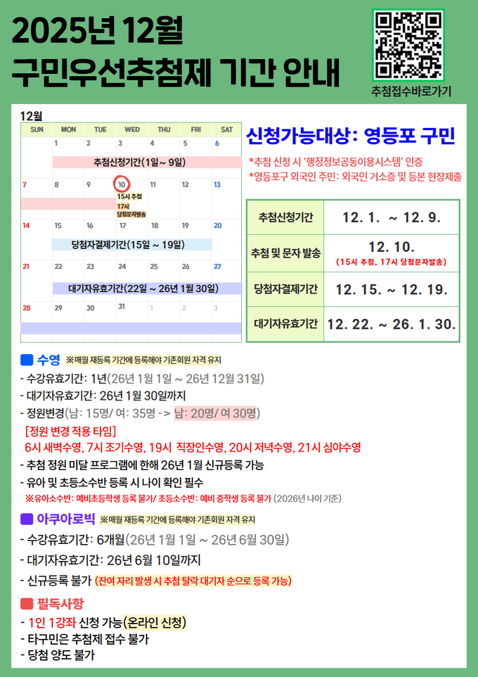 12월 추첨에서 선정된 회원들은 2026년 1월 1일부터 12월 31일까지 1년간 수영 프로그램을 이용할 수 있으며, 등록 방법은 기존과 동일하다.