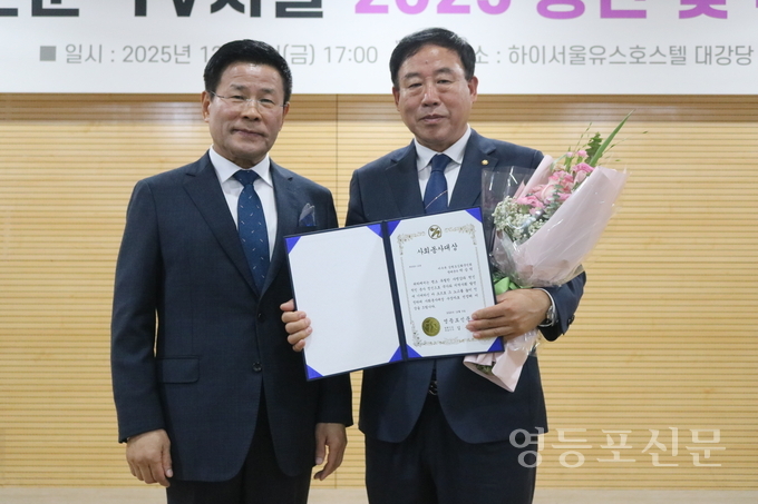 [영등포신문=한미령 편집자문위원] 박승덕 미수복 강원도 김화군민회 명예군수(현 재경 영등포강원향우회장)가 지난 5일 오후 영등포동 소재 하이서울유스호스텔 대강당에서 열린 영등포신문‧TV서울(대표이사 회장 김용숙) ‘2025 송년 및 후원의 밤’ 행사에서 사회봉사대상을 수상하는 영예를 안았다.