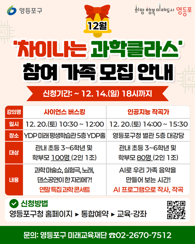 관내 초등학교 3~6학년 자녀 1명과 학부모 1명이 1팀으로 신청해야 하며, ‘사이언스 버스킹’은 50팀, ‘인공지능 작곡가’는 40팀을 모집한다. 오는 12월 14일까지 영등포구 누리집(홈페이지) 통합예약시스템에서 신청할 수 있으며 참가자는 추첨을 통해 선정된다.