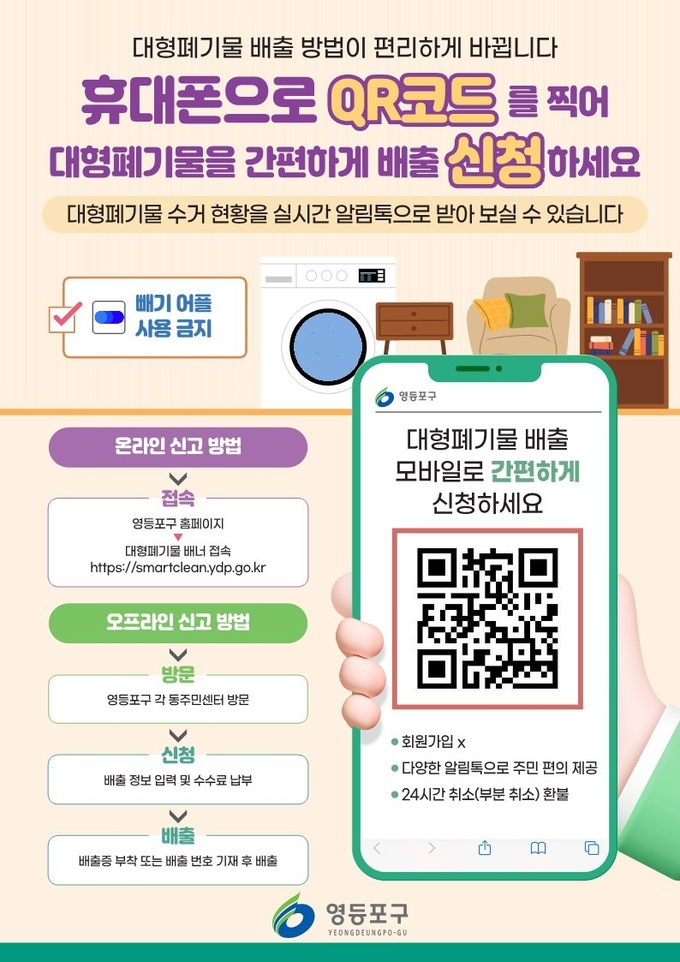 [영등포신문=변윤수 기자] 영등포구가 대형폐기물 수거 과정에서 발생하던 처리 지연, 환불 등 구민 불편을 해소하기 위해 ‘대형폐기물 실시간 수거관리 시스템’을 도입하고 내년 1월부터 시행한다고 밝혔다.