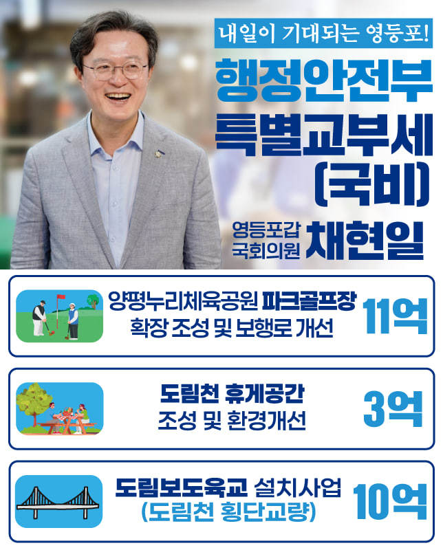 [영등포신문=이천용 기자] 채현일 국회의원(더불어민주당, 영등포갑)은 2025년도 하반기 행정안전부 특별교부세(국비)를 확정지었다고 밝혔다.