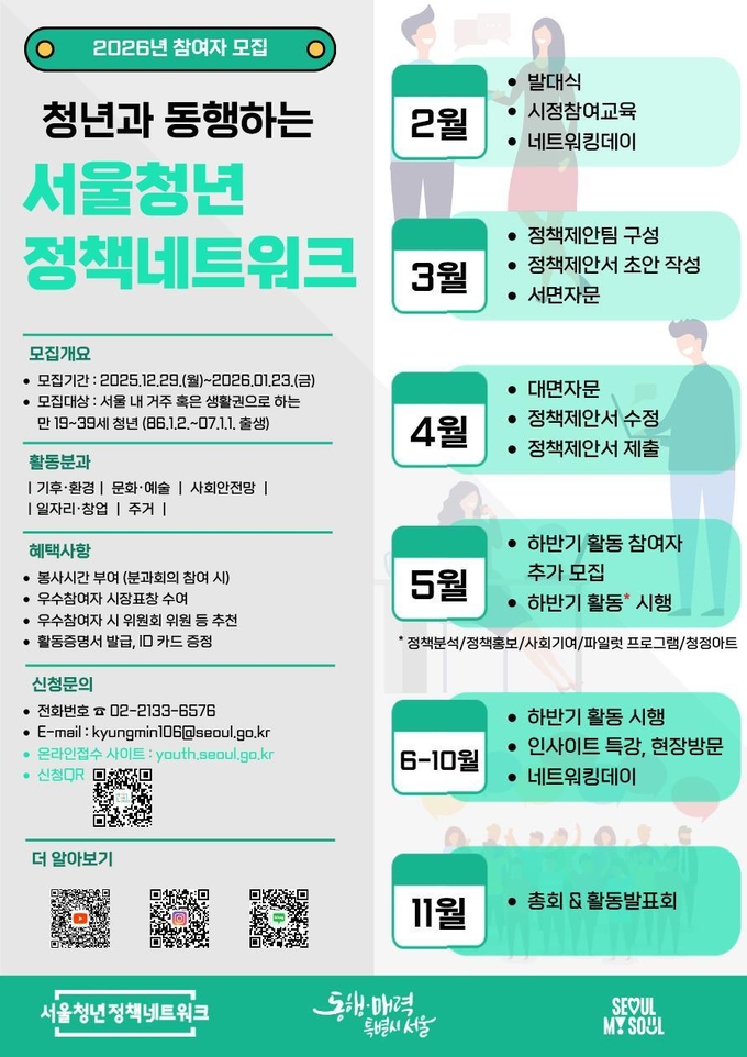 2013년 출범 이래 청년수당, 고립·은둔청년 지원 등 청년의 삶을 변화시키는 정책의 산실이 된 서울청년정책네트워크가 2026년 신규 위원을 모집한다. 청정넷은 서울을 거주지 또는 생활권(서울 소재 대학 재·휴학생, 직장 재·휴직자 등)으로 두고 있는 만 19~39세 청년이 참여할 수 있다.
