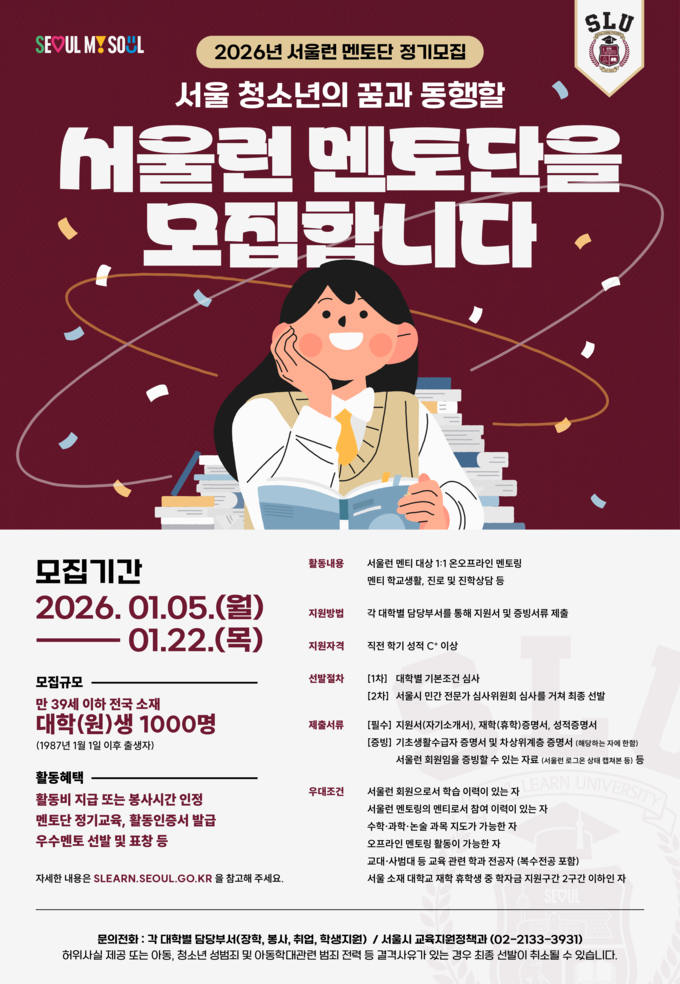 지원 자격은 직전 학기 성적이 C+ 이상인 만 39세 이하의 대학(원)생으로, ▴서울런 회원으로서 학습 이력이 있는 자 ▴서울런 멘토링의 멘티로서 참여 이력이 있는 자 ▴수학·과학·논술 과목 지도가 가능한 자 ▴오프라인 활동이 가능한 자 ▴교대·사범대 등 교육 관련 학과 전공자(복수전공 포함) ▴서울 소재 대학(원)생 중 학자금 지원구간 2구간 이하인 자 등은 선발 시 우대한다. 자세한 내용은 서울런 누리집(slearn.seoul.go.kr)에서 확인할 수 있다.