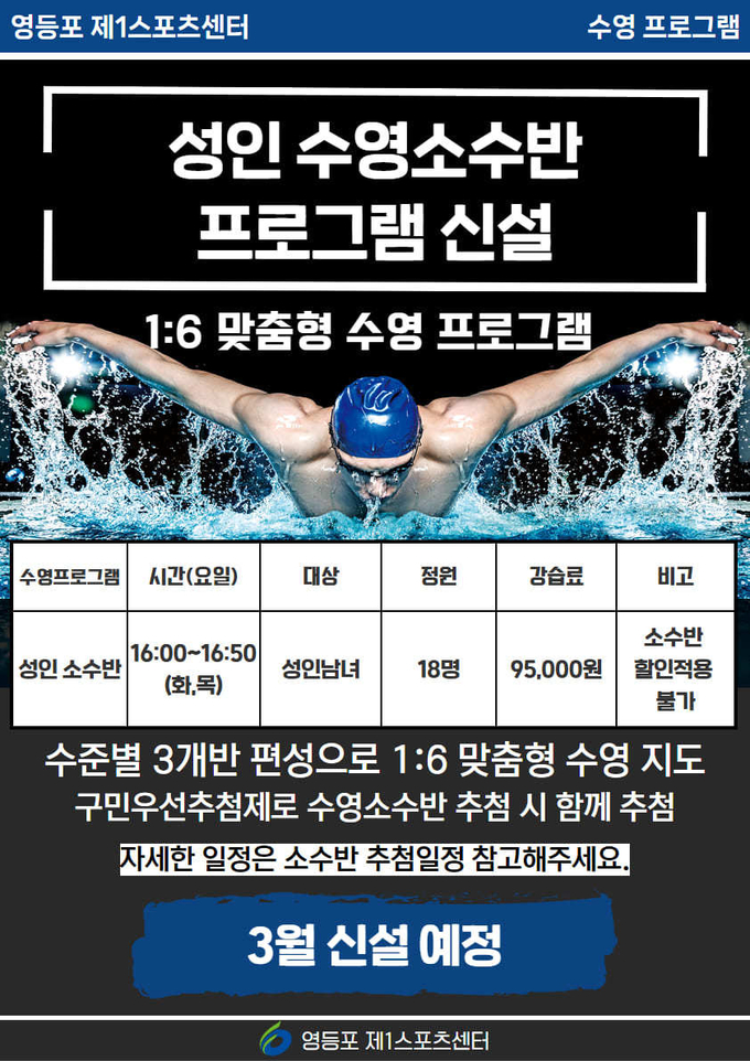 [영등포신문=신민수 기자] 영등포구시설관리공단(이사장 김형성) 영등포 제1스포츠센터에서는 2026년 3월 수영성인소수반 신설예정이며, 수영초등소수반 및 골프 추첨과 함께 구민우선추첨제를 시행할 예정이다.