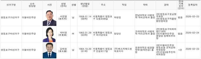[영등포신문=이천용 기자] 오는 6월 3일 실시되는 제9회 전국동시지방선거에 출마하기 위해 영등포구선거관리위원회에 등록한 영등포지역 구청장, 시·구의원 예비후보 현황은 아래와 같다. (2026년 2월 25일 오전 10시 현재)