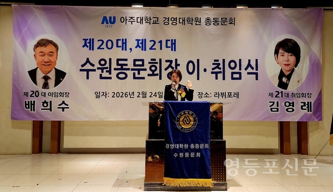 [영등포신문=김수인 기자] 아주대학교 경영대학원 총동문회 수원동문회(이하 수원동문회)는 지난 24일 오후 6시, 수원시 팔달구 인계동 소재 호텔라뷔포레에서 제20·21대 동문회장 이·취임식을 성대하게 거행했다. 이날 행사에는 역대 회장단과 교내 주요 인사, 지역 경제계 인사 등 200여 명이 자리를 함께하며 새 지도부의 출발을 축하했다.