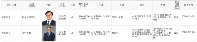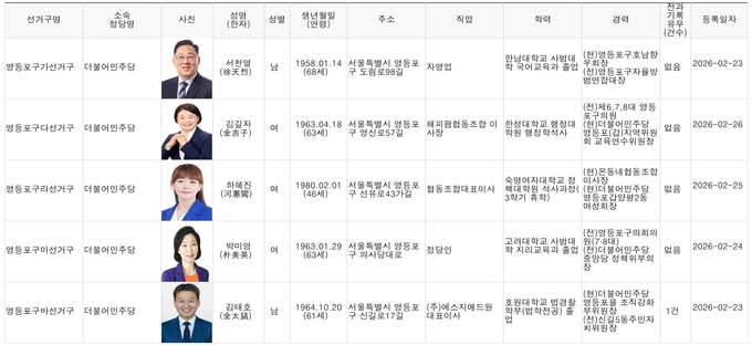 [영등포신문=이천용 기자] 오는 6월 3일 실시되는 제9회 전국동시지방선거에 출마하기 위해 영등포구선거관리위원회에 등록한 영등포지역 구청장, 시·구의원 예비후보 현황은 아래와 같다. (2026년 2월 27일 오전 9시 현재)