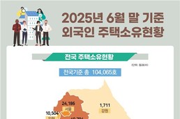 [영등포신문=곽재근 기자] 외국인이 국내에서 보유한 주택이 약 10만4천 가구로 집계됐다. 28일 국토교통부가 발표한 외국인 토지·주택 보유 통계에 따르면 올 6월 말 기준으로 외국인이 소유한 국내 주택은 10만4,065가구로, 작년 12월 대비 0.15% 증가했다. 국내 전체 주택 중 외국인 소유 비중은 0.53%다. 주택을 소유한 외국인은 10만2,477명이다. 소유 지역은 수도권이 7만5,484가구(72.5%), 지방이 2만8,581가구(27.5%)였다. 시도별로는 경기도가 4만794가구(39.2%)로 가장 많았고 이어 서울 2만4,186가구(23.2%), 인천 1만504가구(10.1%), 충남 6,455가구(6.2%), 부산 3,160가구(3.0%) 등 순이었다. 소유자 국적은 중국이 5만8,896가구(56.6%)로 절반을 넘었고 미국 2만2,455가구(21.6%), 캐나다 6,433가구(6.2%), 대만 3,392가구(3.3%), 호주 1,959가구(1.9%) 등으로 집계됐다. 주택 유형은 아파트와 연립·다세대 등 공동주택(9만5,150가구)이 대부분을 차지했고 단독주택은 8천915가구였다. 보유 주택 수는 1채가 9만5,717명(93.4%)으로 가