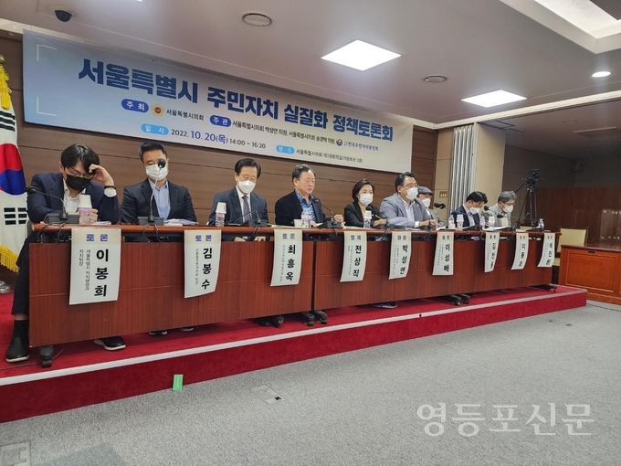 [영등포신문=이천용 기자] 서울시의회 박성연 의원(국민의힘·광진2)은 10월 20일 서울시의회 의원회관 제1대회의실에서 ‘서울특별시 주민자치 실질화 정책토론회’를 개최했다. 이번 토론회는 서울시의회가 주최했으며, 박성연 의원과 송경택 의원, 한국주민자치중앙회의 공동 주관으로 개최됐다.