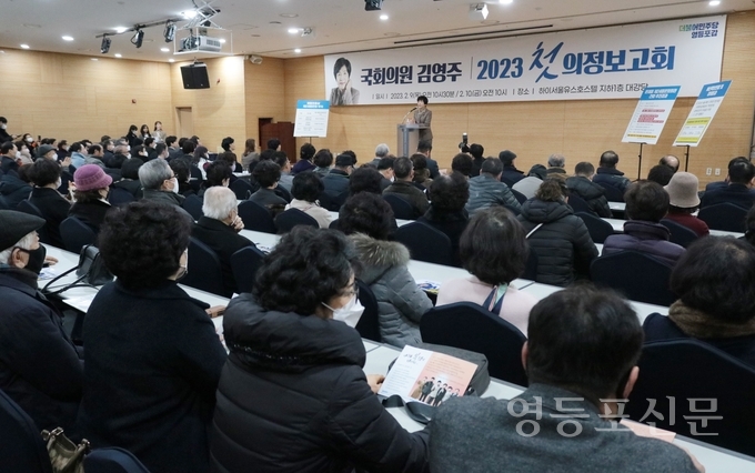 [영등포신문=이천용 기자] 더불어민주당 김영주 국회의원(현 국회부의장, 영등포갑)은 9일 오전 영등포구 당산동 하이서울유스호스텔 지하1층 대강당에서 ‘2023년 의정보고회’를 개최했다.