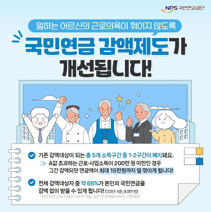 어르신들의 일할 의지를 고취하고 안정적인 노후소득을 보장하기 위해 일하는 경우 국민연금이 감액되는 제도를 개선한다. 기존에는 국민연금 전체 가입자의 평균소득 309만 원(이하 “A값”) 보다 많은 근로소득과 사업소득이 있는 경우 A값을 초과하는 월 소득을 100만원 단위의 5개 구간으로 나누어 5~25%에 해당하는 금액을 연금액에서 감액하였다. 즉, 초과소득월액이 100만 원 미만이면 최대 5만원, 200만원 미만이면 최대 15만 원이 연금액에서 깍이는 구조였다.