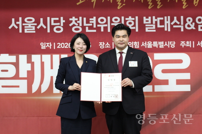 [영등포신문=이천용 기자] 영등포구의회 박현우 의원(여의동, 신길1동)이 지난 16일 오후 2시 여의도 소재 국민의힘 서울시당 4층에서 배현진 서울시당위원장, 우재준 청년최고위원 등이 참석한 가운데 열린 서울시당 청년위원회 발대식 및 임명식에서 부위원장으로 임명됐다.