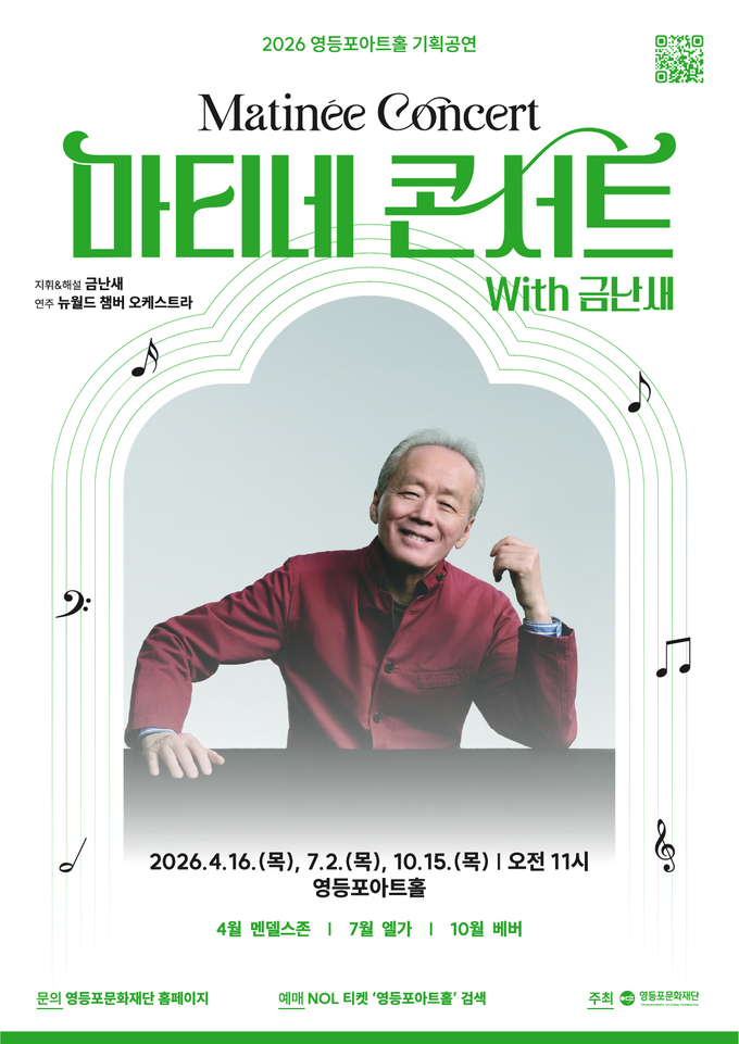 이건왕 영등포문화재단 대표이사는 “마티네콘서트는 클래식을 일상에서 자연스럽게 접할 수 있는 영등포아트홀의 대표 기획공연”이라며 “지휘자 금난새의 해설과 함께하는 이번 시즌이 관객들에게 깊이 있는 음악적 경험과 여유로운 한낮의 시간을 선사하길 바란다”고 전했다.