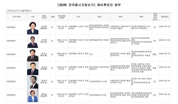 [영등포신문=이천용 기자] 오는 6월 3일 실시되는 제9회 전국동시지방선거에서 치러지는 서울시교육감선거에 출마하기 위해 제17·18대 국회의원을 지낸 임해규 낙타재단 이사장과 제21대 국회의원을 지낸 강민정 한국교원대학교 교육정책전문대학원 전문경력교수를 비롯해 김영배 예원예술대 부총장, 류수노 한성대 석좌교수, 윤호상 한양대 교육대학원 겸임교수, 홍제남 다같이 배움연구소장 등이 지난 3일 예비후보 등록을 마쳤다.