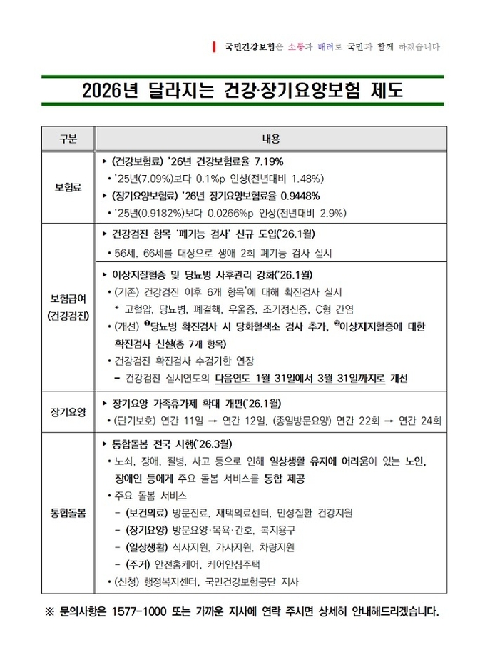 [영등포신문=이천용 기자] 국민건강보험공단 영등포남부지사(지사장 이회승)는 12일 '2026년 달라지는 건강·장기요양보험 제도'에 대해 아래와 같이 안내했다.