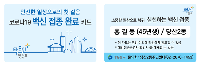 [영등포신문=이천용 기자] 영등포구가 오는 17일부터 코로나19 백신 접종자에게 백신 접종 완료를 기념하는 카드를 서울시 최초로 배부한다고 밝혔다.