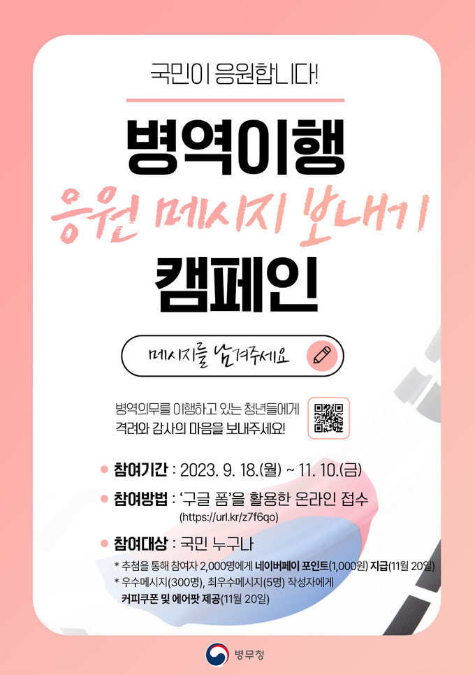 ‘응원 메시지 보내기’는 병역의무를 이행하고 있는 청년들이 자긍심을 갖고 복무할 수 있도록, 병무청이 2010년부터 매년 실시하고 있는 범국민 캠페인이다
