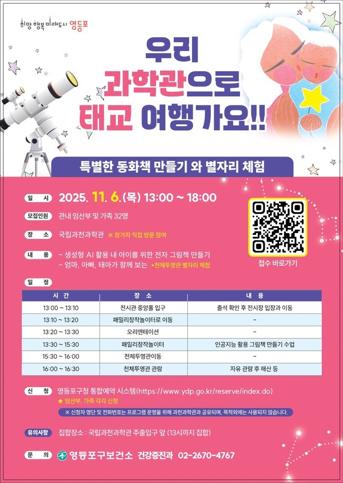 [영등포신문=곽재근 기자] 영등포구가 예비 부모와 태아가 함께 교감하는 특별 체험 프로그램 ‘과천과학관 태교 여행’ 참여자를 모집한다고 밝혔다.