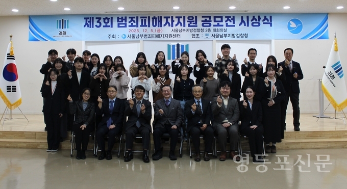 [영등포신문=이천용 기자] 서울남부범죄피해자지원센터(이사장 장석일)가 주관하고, 서울남부지방검찰청이 협조한 ‘제3회 범죄피해자지원 소논문 및 홍보아이디어 공모전’ 시상식이 지난 5일 서울남부지방검찰청 2층 대회의실에서 개최됐다.