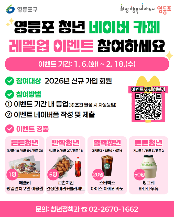 [영등포신문=변윤수 기자] 영등포구가 지역 청년들의 온라인 소통과 커뮤니티 참여를 확대하기 위해 ‘영등포 청년 네이버 카페 회원 레벨업 이벤트’를 진행한다고 밝혔다.