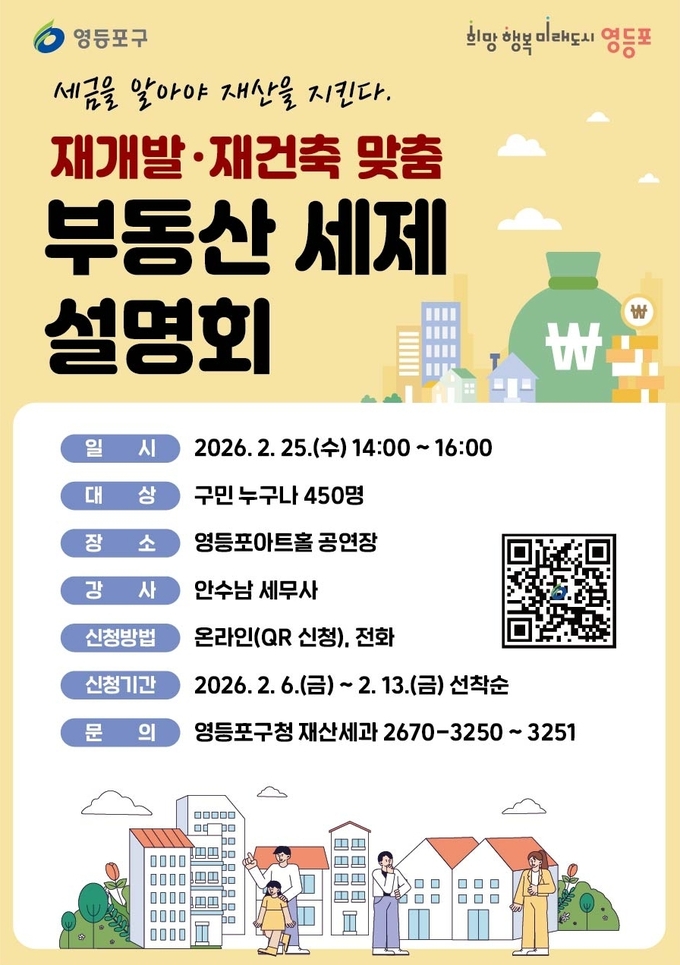 [영등포신문=변윤수 기자] 영등포구가 영등포 전역에서 87개 재개발 재건축 등 정비사업이 추진되면서 높아진 부동산 세제에 대한 관심에 부응하고자, 오는 25일 영등포 아트홀에서 ‘재개발 재건축 맞춤 부동산 세제 설명회’를 개최한다고 밝혔다.