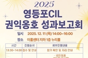 [영등포신문=변윤수 기자] 해오름장애인자립생활센터(센터장 안권수, 이하 해오름센터)는 지난 11월 21일 이룸센터 누리홀에서 구의원 및 유관기관, 지역주민들이 함께한 가운데, ‘2025 당사자 권익찾기 보고회’를 개최했다. 올해로 6번째를 맞은 ‘당사자 권익찾기 보고회’는 지역사회의 장애 이해를 높이고, 당사자가 스스로 정당한 권익을 누릴 수 있는 지역환경을 만들기 위한 목적으로 진행되고 있으며, 이에 영등포구의회의 장애인 정책을 ‘장애인 정책의정모니터링단’ 활동을 통해 확인 및 점검, 제안하는 활동을 꾸준히 하고 있다. 이날 정책의정모니터링 결과 구의회 사회건설위원회 전승관·이성수 의원을 각각 우수활동 구의원으로 선정해 감사패를 전달하고, 지속적인 장애인 권익을 위해 힘써 줄 것을 당부했다. 2025년도 해오름 센터의 사업들에 대한 보고와 이미용 봉사자 유춘광님에 대한 감사패 전달식도 함께 진행됐다. 또한, 올해 사회적협동조합 너섬나들이와 함께한 아트클래스 미술작품 전시회도 진행됐으며, 아트클래스 영상상영 및 작품설명을 위한 리플렛 배포도 이뤄졌다. 안권수 센터장은 “올해 6회째 이어져 오는 행사가 뜻깊게 마무리 될수 있어 보람이 있고, 앞으로도 장애인의