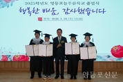 [영등포신문=이천용 기자] 영등포구는 1월 28일 오후, 구청 별관 대강당에서 배움의 기회를 놓쳤던 어르신들이 초등․중학 학력을 인정받는 성인문해학교 ‘늘푸름학교’ 졸업식을 개최했다. 구에서 직접 운영 중인 ‘영등포 늘푸름학교’는 초등‧중학 학력을 인정받을 수 있는 성인문해 교육기관으로, 현재 초등 및 중학 과정을 포함해 총 6개 반이 운영되고 있다. 이날 초등반 20명, 중학반 25명의 만학도가 졸업장을 받았으며, 교장인 최호권 구청장을 비롯해 구의회 이규선 운영위원장과 이순우 의원, 늘푸름학교 관계자, 재학생 및 졸업생 가족 등이 함께하며, 어르신들이 배움의 열정을 통해 졸업이라는 결실을 맺게 된 것에 대해 축하의 마음을 전했다. 졸업식은 ▲재학 시 활동 영상 시청 ▲졸업장 수여 ▲상장(개근상‧우정상‧우수학습자상) 수여 및 소감 발표 ▲졸업생 공연(칼림바, 합창) ▲졸업생 감사편지 낭독 ▲졸업소감 발표, AI영상, 가족 축하 영상 시청 및 편지 낭독 순으로 진행됐다. 이날 초등과정 졸업생 김영만 씨의 감동적인 사연은 행사의 특별한 의미를 더했다. 김씨는 늘푸름학교로 자신을 데려와 글을 깨우치게 해 준 아내에게 감사 편지를 쓰는 것이 소원이었지만, 갑작스러